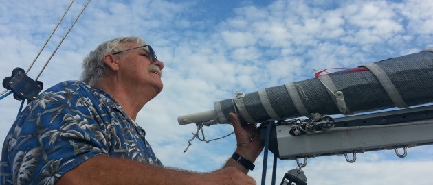 In his blue floral-printed Hawaiian shirt and sunglasses, Eberhard Alsen happily greets two Cornell sailing students from his sailboat, a white 1986 Tanzer 25.